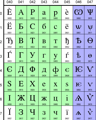 Первый вопрос, возникающий при проектировании церковно-славянской кодировочно-шрифтовой системы (КШС) -- где в кодовом пространстве размещать основные символы? Как было сказано в обзоре церковно-славянского письма, этому языку даже в позднем изводе, даже без учета лигатур требуется порядка полусотни символов строчного регистра и чуть меньше -- заглавного. Не так уж много и для 8-битной, и для 16-битной кодировки. Но как разместить их наиболее корректно? Вспомним, распространенные операционные системы изначально не поддерживают церковно-славянский язык, эту поддержку приходится делать самим. Логичнее было бы, если позволяет ситуация, строить КШС на основе какого-то уже имеющегося в системе близкого к ЦС языка, дабы, во-первых, минимизировать работы по дополнению системы и, во-вторых, при отсутствии достроенной нами системной поддержки ЦС можно было бы хоть как-то работать с ЦС текстами, опираясь на возможности по вводу на родственном языке.